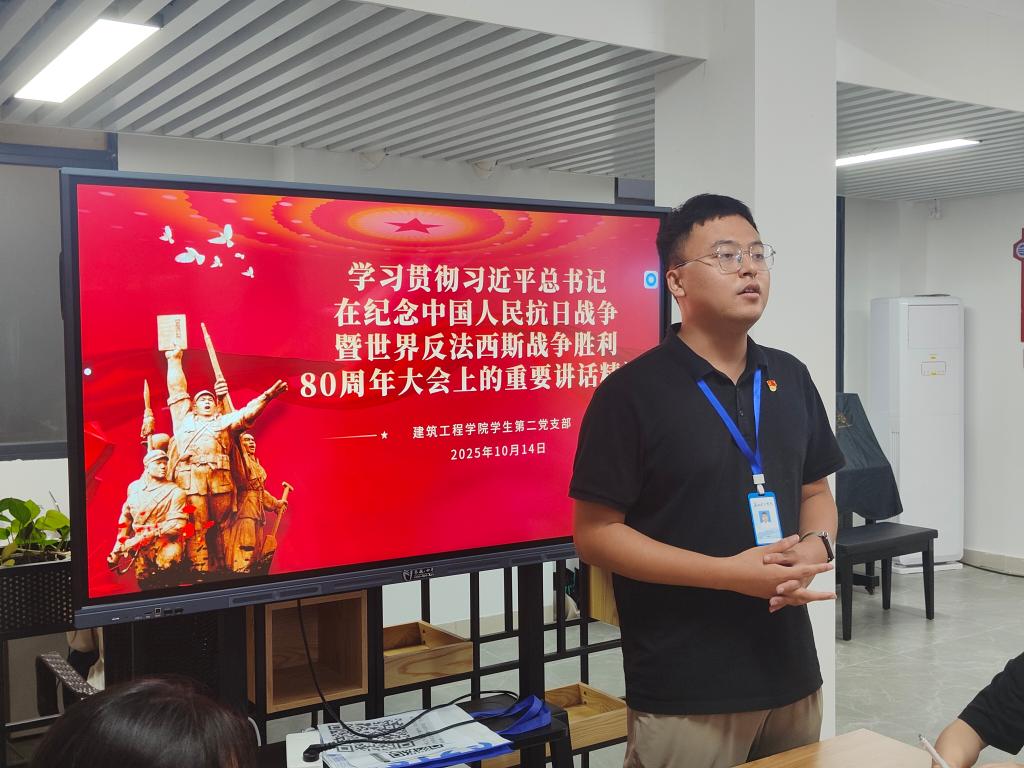 10月14日晚,为了贯彻习近平总书记在纪念中国人民抗日战争暨世界反法西斯战争胜利80周年大会上的重要讲话精神,建筑工程学院学生第二党支部在学生第一社区活动室组织开展贯彻习近平总书记在纪念中国人民抗日战争暨世界反法西斯战争胜利80周年大会上的重要讲话精神”主题党课学习。全体在校党员、预备党员、发展对象和党务助理参与学习。学生第二党支部书记姚章泽主讲。