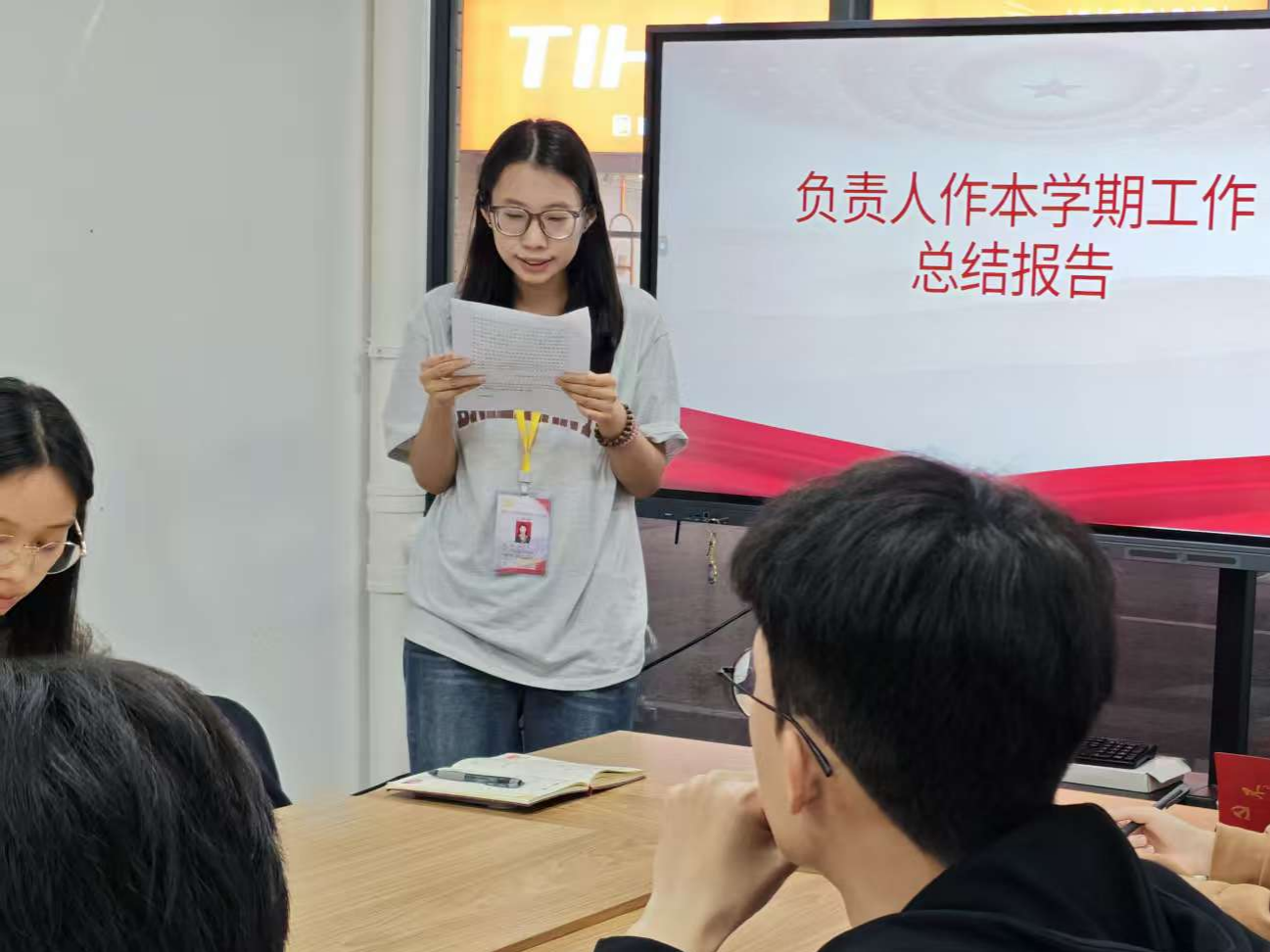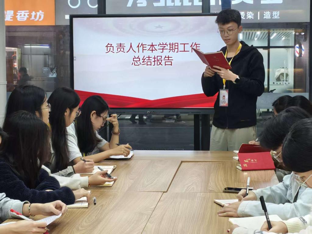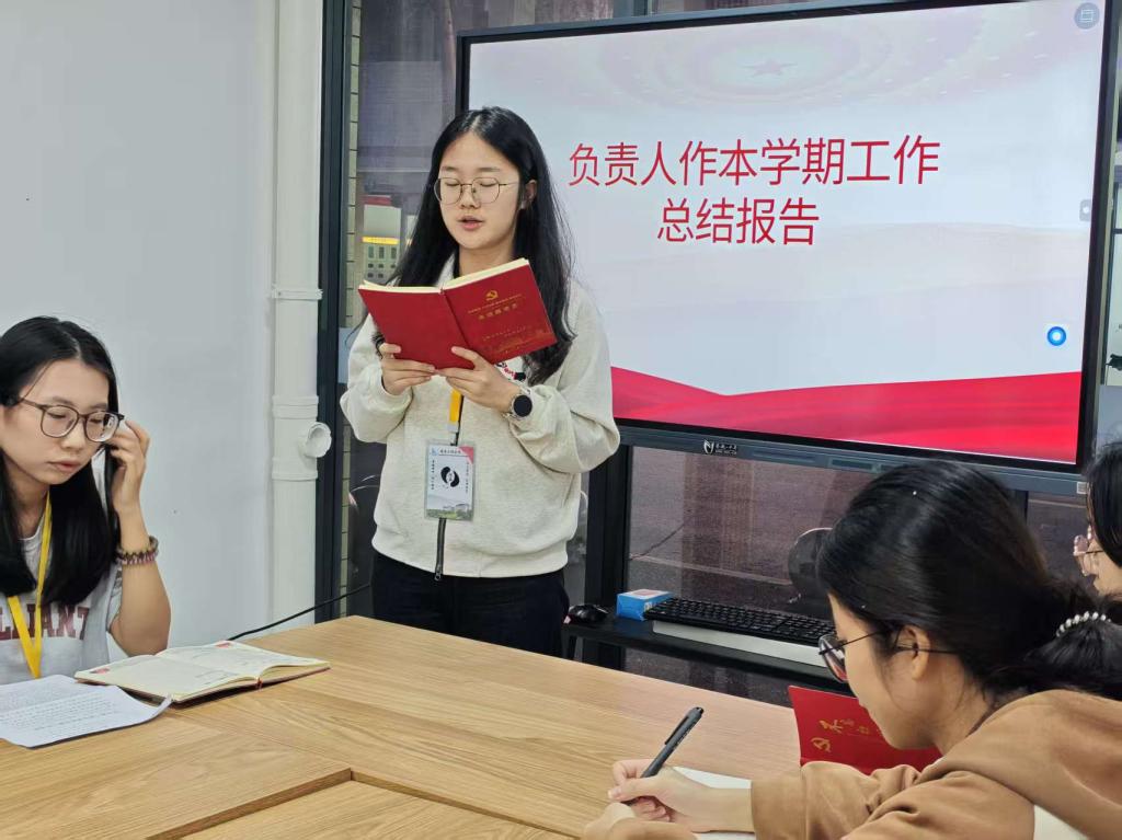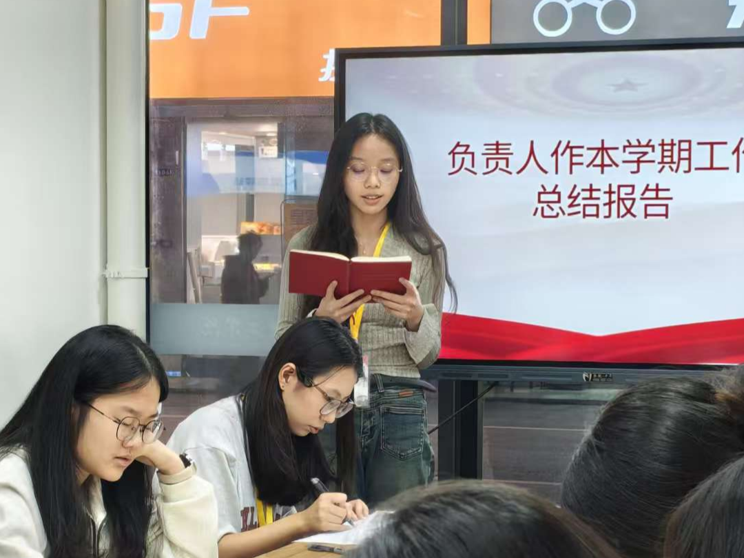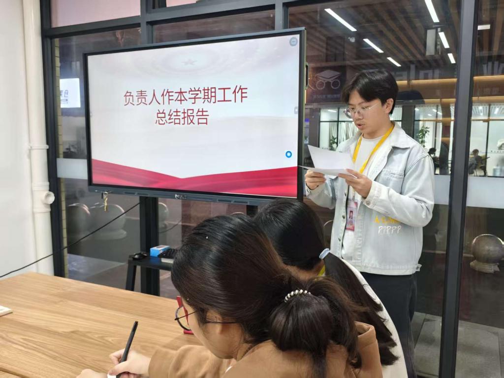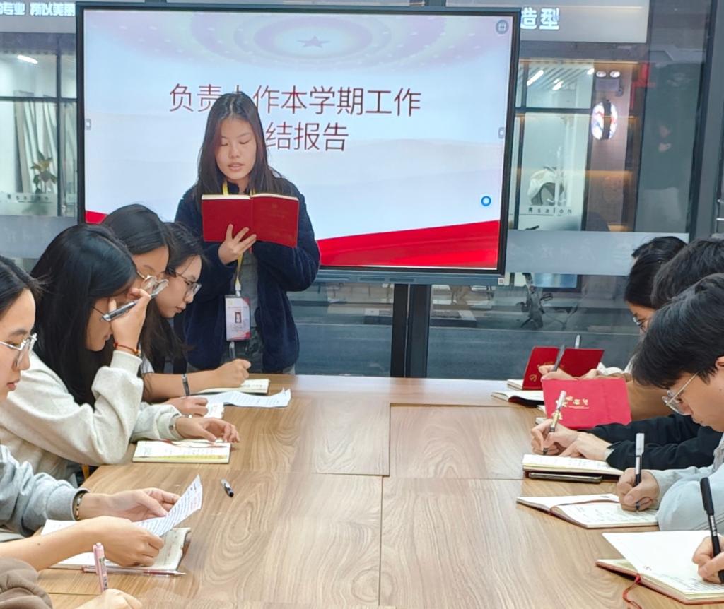 莫翘恺同志就入党积极分子培训和会议记录工作进行了总结。他表示,本学期吸纳入党积极分子均已完成党校培训;针对此前大一线上竞选过程中出现的沟通不畅、设备收音不佳等问题,已落实整改;会议记录已实现分类归档并建立电子目录,但对复杂议题记录的规范性与准确性仍需加强审核把关。