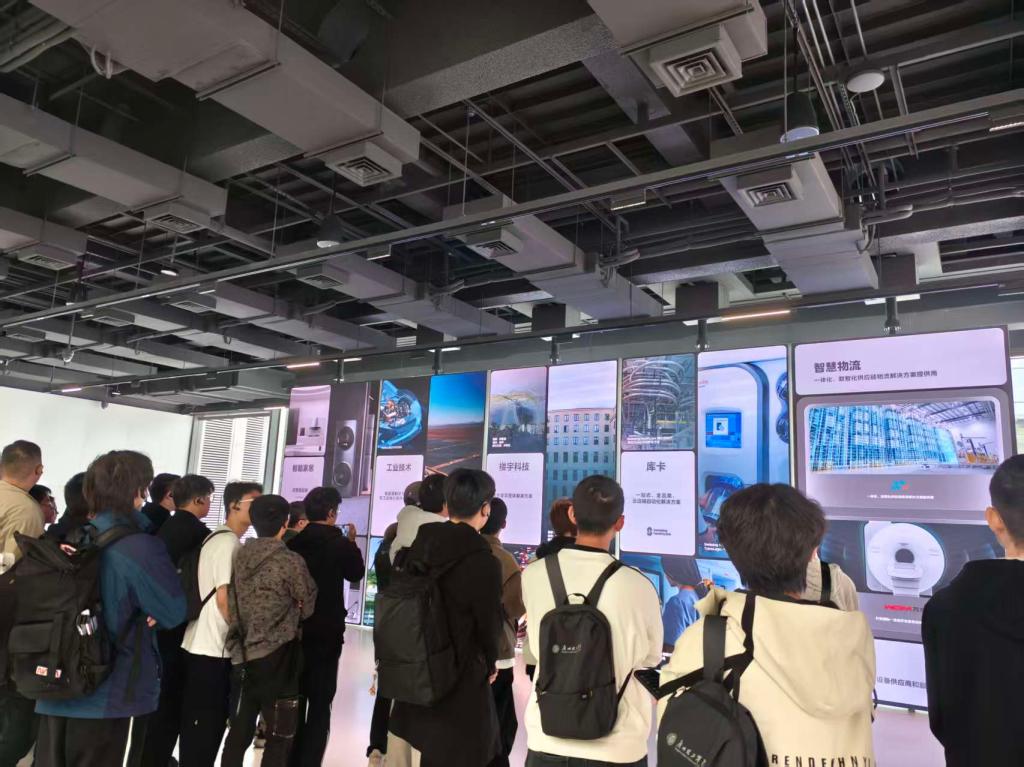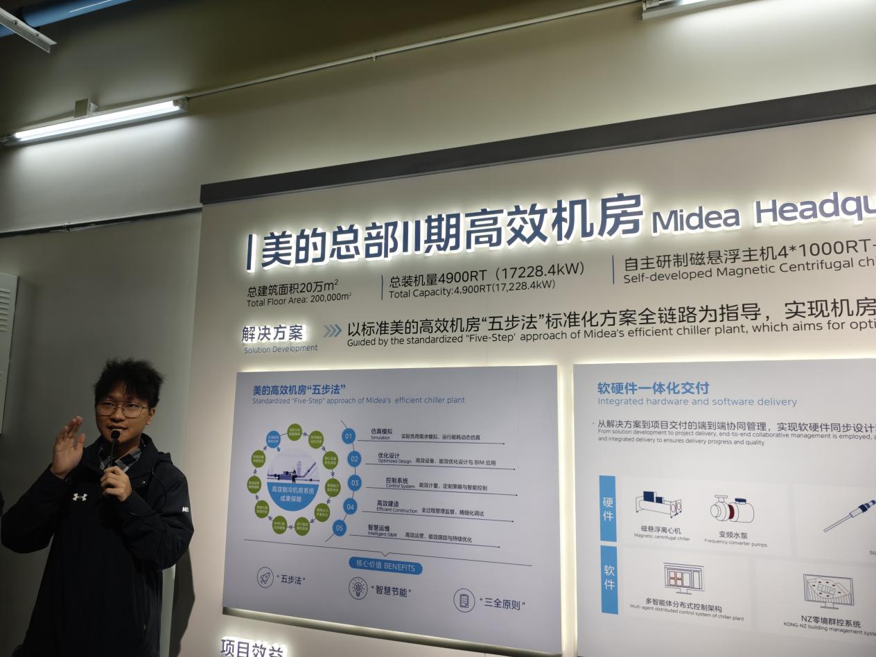 当天上午,师生们与何所首先参观了美的总部大厦08展厅,全面了解了美的集团的发展历程、业务板块与企业文化。随后,大家深入参观了高效机房,其对能源效率的精益求精与智能化管控系统,展现了现代建筑在零碳、绿色节能领域的尖端技术应用。