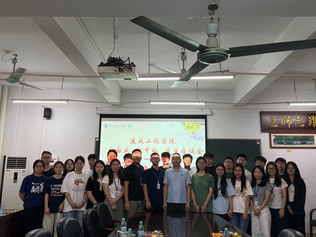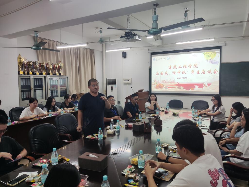 (通讯员:梁文俊)在传统中秋和国庆佳节即将来临之际,为弘扬爱国主义精神,传承中华优秀传统文化,进一步增进学院师生交流,倾听学生心声,共话成长发展。9月28日晚,建筑工程学院组织在9栋306开展“庆国庆·迎中秋”学生座谈会,学院相关教师与学生干部代表相聚一堂,共叙师生情谊、共话节日祝福。