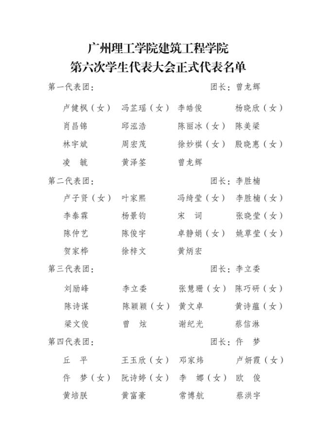 现将广州理工学院建筑工程学院第六届学生代表大会正式代表名单公示如下(按姓氏笔画为序排列):