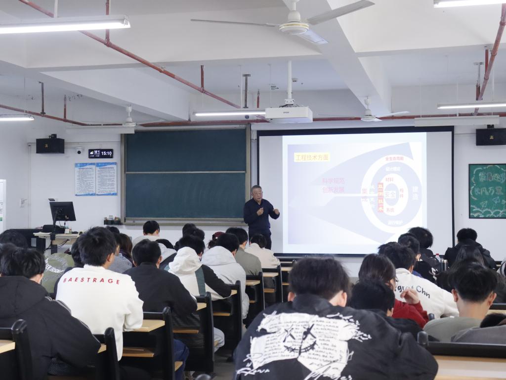 屏幕中突出的“法治与伦理”“干系人管理”等内容,进一步强调了工程实践中合规性与人文关怀并重的理念。赵教授从历史、社会、运行三个维度阐释工程质量检验标准,确保每一项工程经得起时间与社会的考验。本次专家讲座通过理论讲解与案例剖析相结合的方式,不仅提升了学生的专业素养,更促进了行业先进理念的传播。