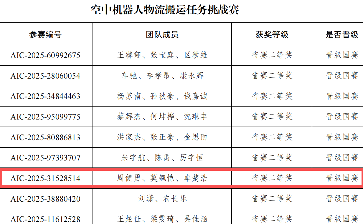 空中机器人物流搬运任务挑战赛获奖名单