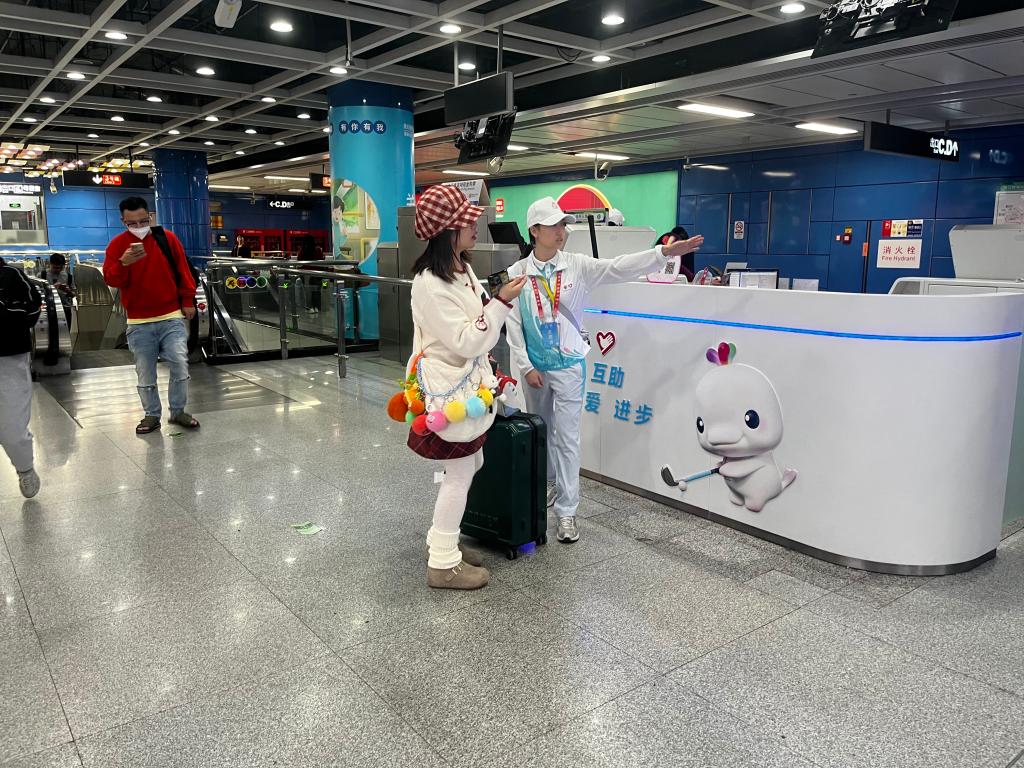 志愿者在站内为乘客提供引导服务