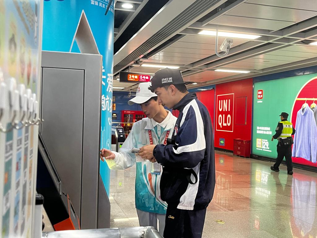 志愿者协助乘客操作购票设备